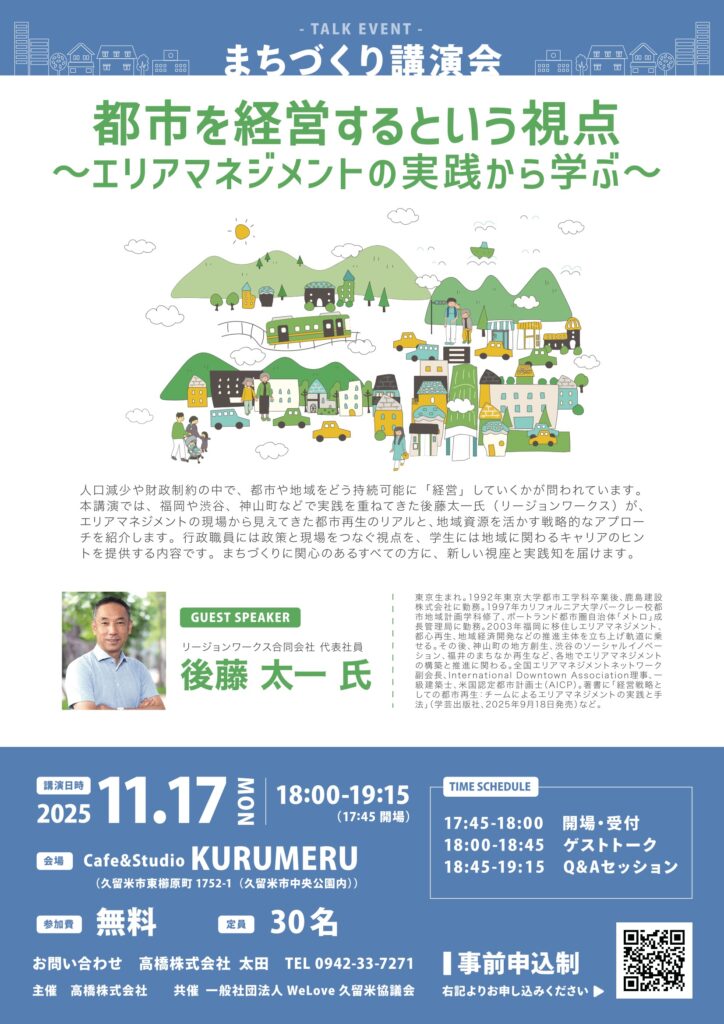 | [ まちづくり講演会「都市を経営するという視点〜エリアマネジメントの実践から学ぶ〜 ] 日時:2025年11月17日(月) 18:00〜19:15(17:45会場) 場所:Cafe&Studio KURUMERU(久留米市東櫛原町1752-1(久留米市中央公園内)) 参加費:無料 定員:30名 主催:高橋株式会社 共催:一般社団法人 WeLove久留米協議会 |