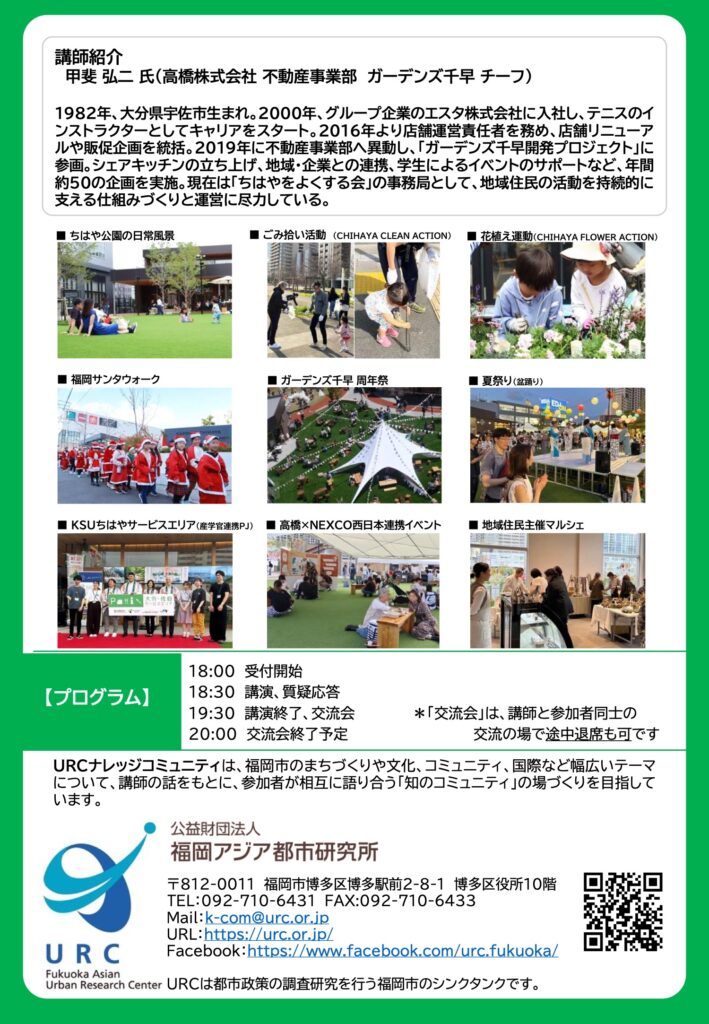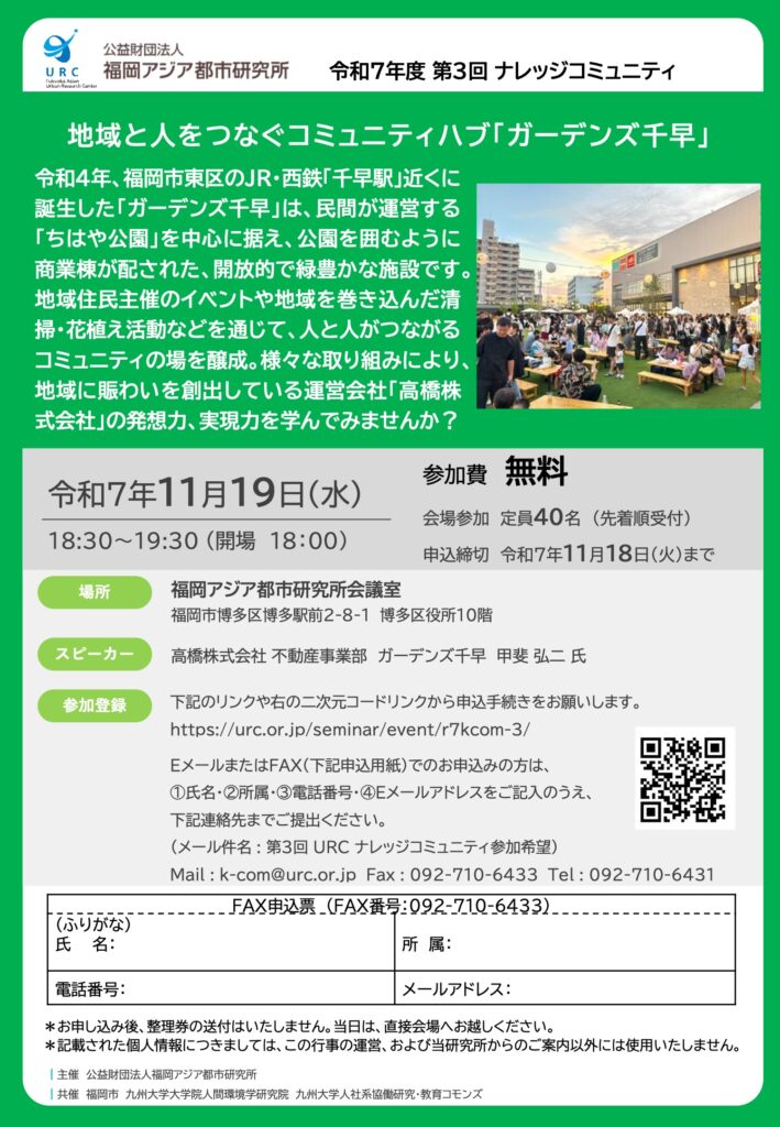 | [ 第3回ナレッジコミュニティ「地域と人をつなぐコミュニティハブ「ガーデンズ千早」」 ] 日時:2025年11月19日(水) 18:30〜19:30(開場 18:00) 会場:福岡アジア都市研究所会議室(福岡市博多区博多駅前2-8-1 博多区役所10F) 参加費:無料 定員:40名 主催:公益財団法人福岡アジア都市研究所 共催:福岡市 九州大学大学院人間環境学研究院 九州大学人社協働研究・教育コモンズ |