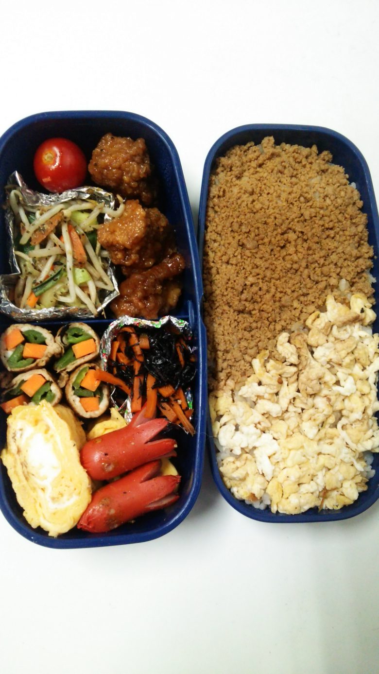鳥そぼろに野菜炒めのバランスのいいお弁当です。
