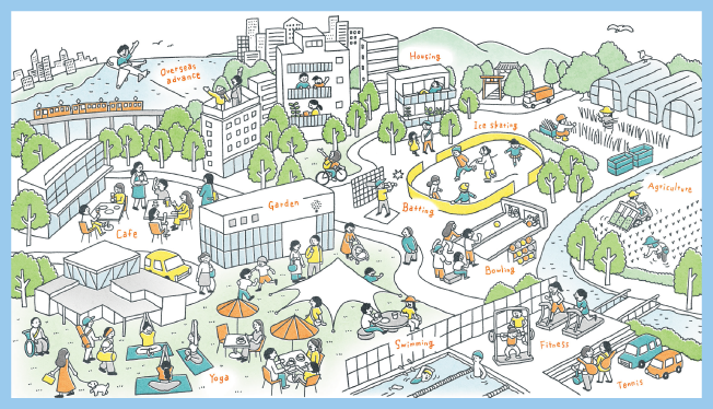 TOPのメインイラストも、高橋グループが手がけるさまざまな事業で1つの“まち”を表現し、わたしたちがお届けするサービス・アイディアで、それぞれのまち・地域のここちよさやそこに住む人々の笑顔や生きがいにつなげたいという想いを込めています。