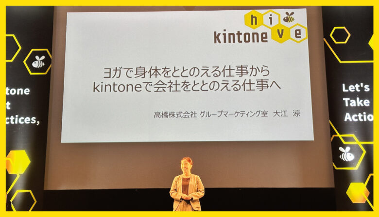 大江さんは「ヨガで身体をととのえる仕事から、kintoneで会社をととのえる仕事へ」と題して、ヨガからシステムへと業務を転換した異色の経歴とともに、高橋グループにはどんなシステム課題があって、どんな機能が必要なのか、どうやってアプリを作っているのか、をプレゼンしました📝
