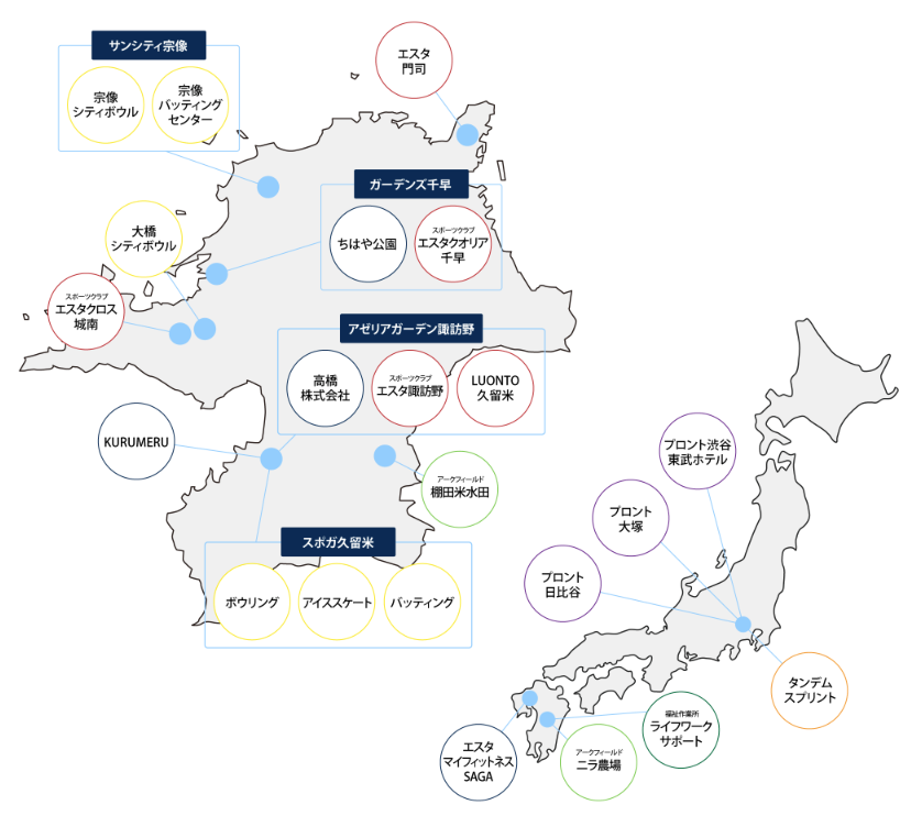 その結果、現在は不動産、スポーツ・レジャー、フィットネス、飲食、農業、商業施設など多角的な事業領域で、福岡を中心に佐賀、熊本、東京へと広がっています。